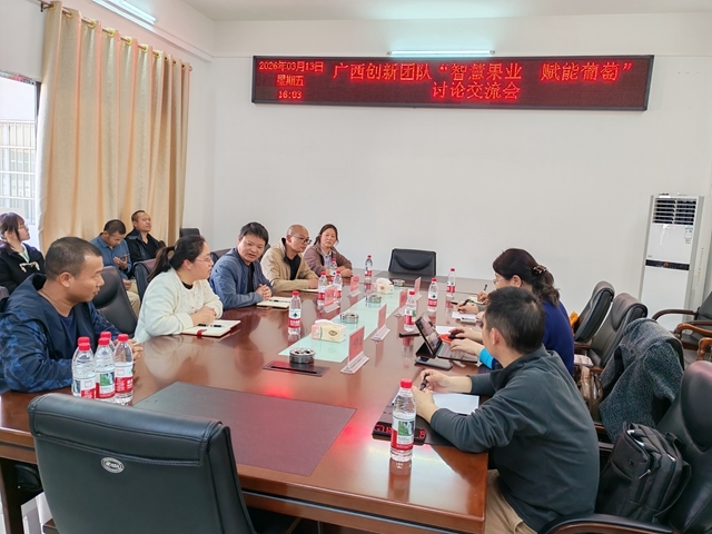 3月13日下午,国家现代农业产业技术体系广西葡萄创新团队与广西特色作物研究院、桂林理工大学到桂林市农业科学研究中心开展“智慧果业 赋能葡萄”研讨交流会。广西葡萄产业创新团队功能岗位专家宋雅琴、广西特色作物研究院正高级农艺师梅正敏、桂林理工大学教授窦世卿、桂林市农业科学研究中心副主任刘伟及各单位技术骨干共20余人参加会议。