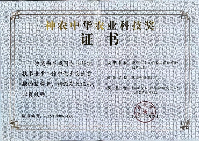 近日,中国农学会公布了2022-2023年度神农中华农业科技奖结果,桂林市农业科学研究中心首次荣获优秀创新团队奖。