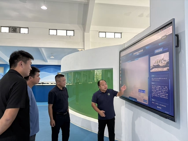 在保育中心珍稀鱼类繁育救护车间,车间负责人向李家文一行展示介绍了鱼类智能识别系统的应用,极大地提升了鱼类水下观察识别的便利性,接着参观了保育中心团队收集保育的斑鳠、乌原鲤等多个珍稀鱼类品种,并交流了亲鱼培育、鱼苗繁殖相关技术。