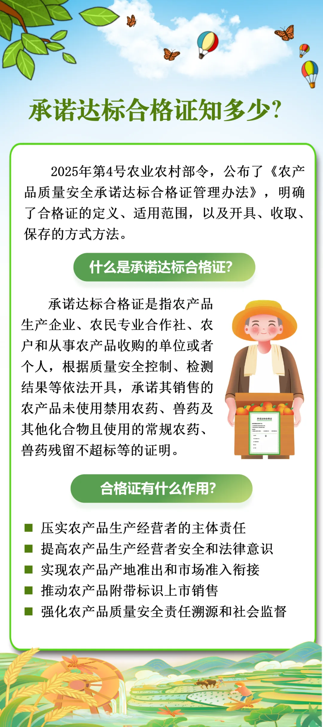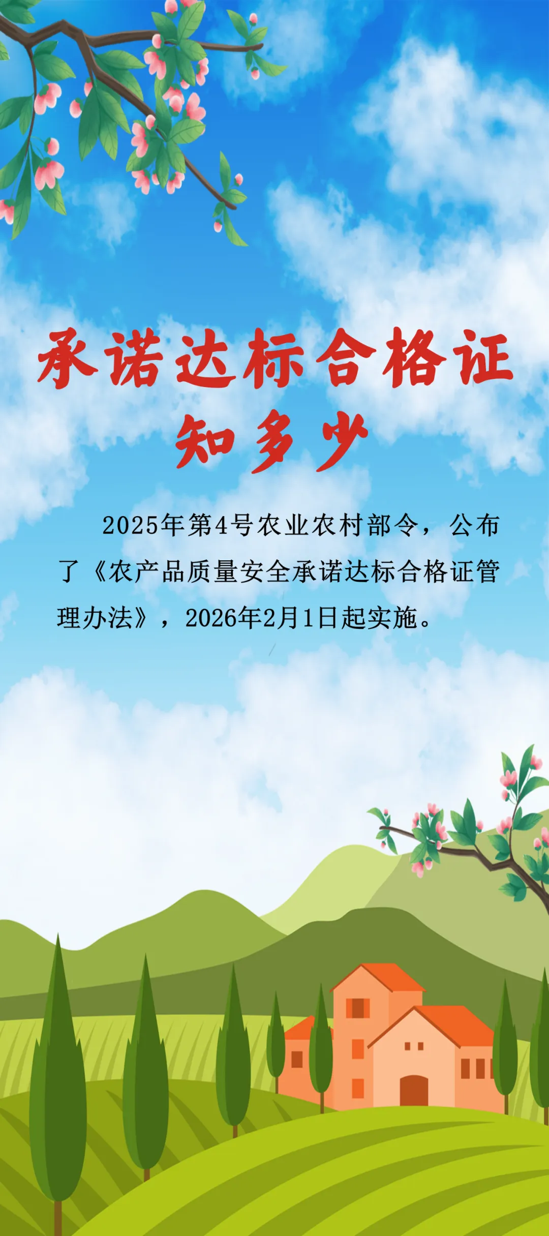 2025年12月2日,农业农村部部长韩俊签发2025年第4号农业农村部令,公布了《农产品质量安全承诺达标合格证管理办法》,将于2026年2月1日起实施。本期农安新创推出解读系列展板、长图供各地参考。