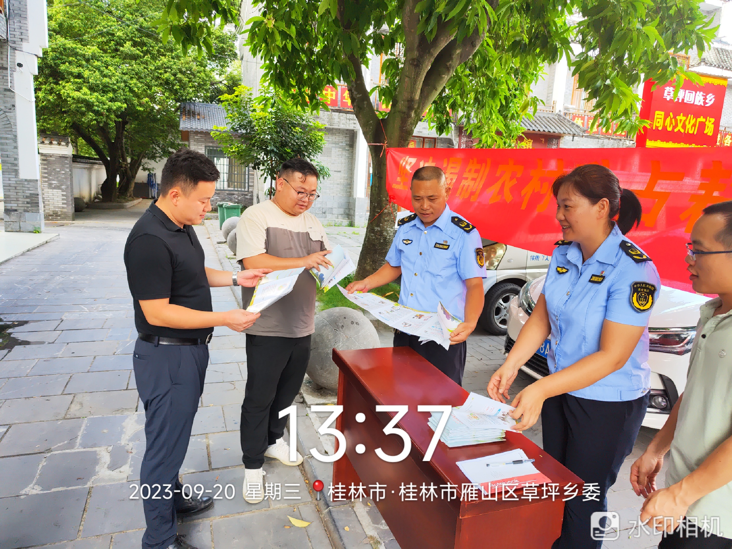 市局人员在雁山区草坪乡主街道旁设置了宣传桌,向来往群众发放农村宅基地政策宣传册
