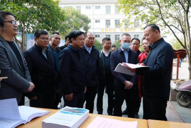 杨勇副书记(右一)翻阅龙虎村“一试点一档案”台账